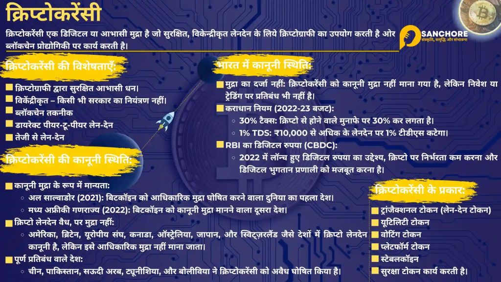 - क्रिप्टोकरेंसी को कानूनी मुद्रा नहीं माना गया है, लेकिन निवेश या ट्रेडिंग पर प्रतिबंध भी नहीं है।